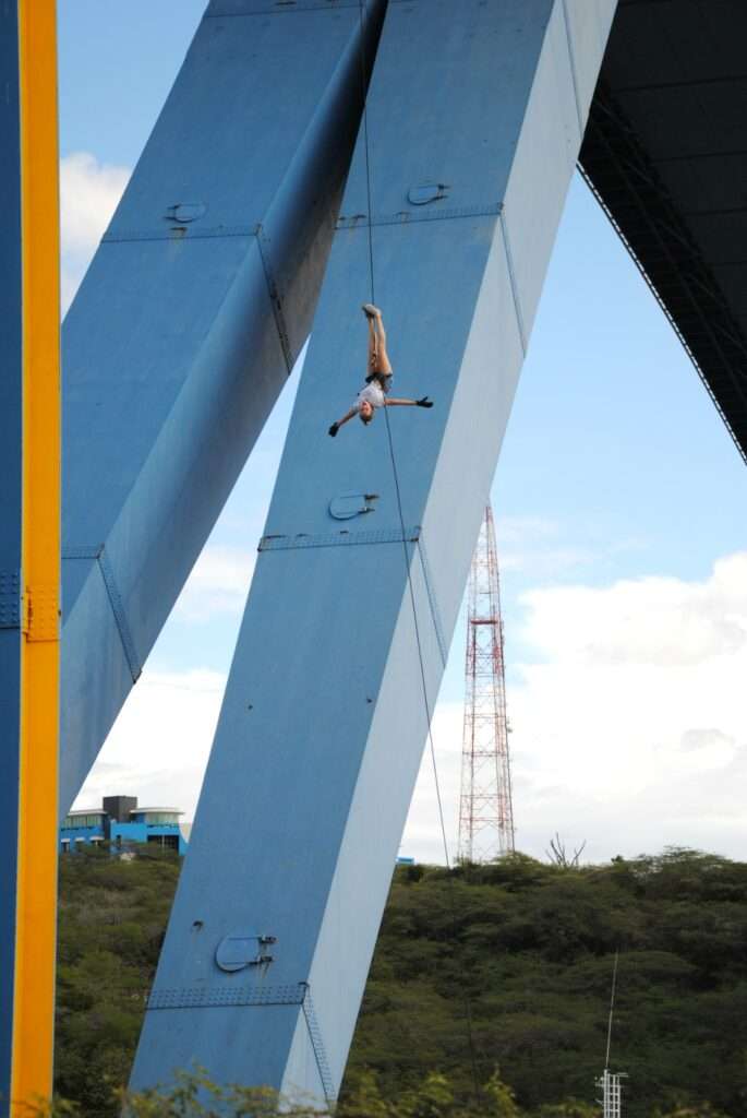 Abseilen op Curaçao doe je onder de iconische Julianabrug. Dit is de verkeersbrug die over de Sint Annabaai heen loopt. Dat betekent dus ook dat je tijdens het abseilen uitzicht hebt over de Handelskade: hoe vet is dat?! Je klimt als het ware ín de brug en kruipt dan door een klein raampje heen op de reling. Met gestrekte benen laat je jezelf achteruit zakken tot je in een hoek van 90 graden tegen de brug aan staat. Dan zet je nog een stapje naar beneden en dan laat je je vallen.